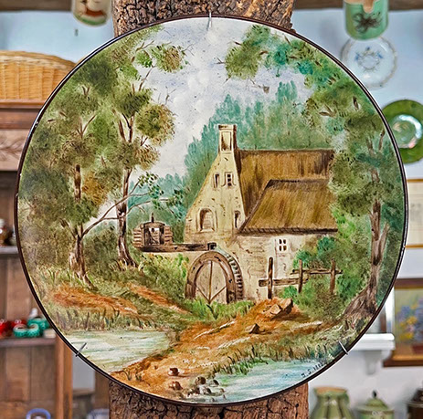 Beautiful antique platter with a water mill scene from the South of France. Signed and dated 1880 lower right.