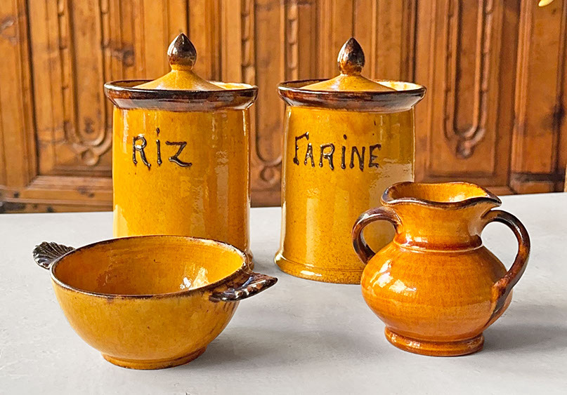 Sunshine yellow for these vintage rice and flour canisters, dainty vase and porringer.